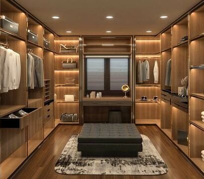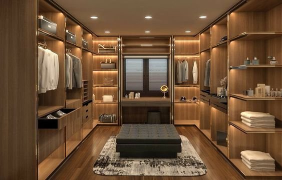 تصميم غرفة ملابس متكامل يعطي إحساس بالرفاهية والتنظيم في نفس الوقت، لأن التقسيمات مفتوحة وواضحة فتسهّل رؤية كل القطع والوصول لها بسرعة. الإضاءة الدافئة داخل الأرفف تبرز التفاصيل وتخلي المكان مريح للاستخدام اليومي، خصوصًا عند اختيار الملابس أو ترتيبها. الوحدة توفر مساحات متعددة للتعليق والرفوف والأدراج، وده يساعد على تنظيم الملابس بحسب النوع أو الموسم مع الحفاظ على شكل مرتب دائمًا. التشطيب الخشبي يعطي دفء وفخامة، ومع وجود مقعد في المنتصف تصبح الغرفة أكثر عملية أثناء اللبس والترتيب. مناسبة لغرف النوم الرئيسية أو المساحات المخصصة للملابس في البيوت الراقية