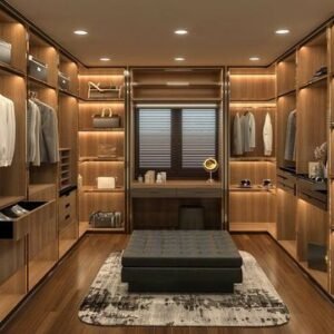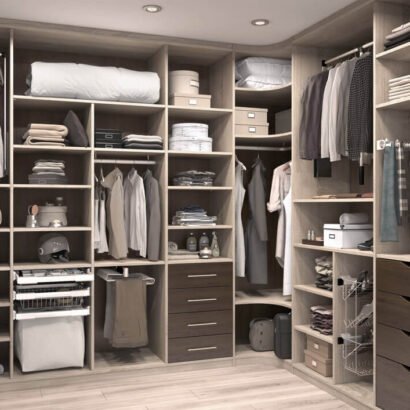 تصميم غرفة ملابس يركز على الاستفادة القصوى من المساحة، لأن كل جزء فيها مخصص لاحتياج مختلف: أماكن تعليق للملابس الطويلة والقصيرة، رفوف للأحذية والحقائب، وأدراج للقطع الصغيرة والإكسسوارات. التقسيمات المفتوحة تخليك تشوف كل شيء قدامك بسرعة وتختار بسهولة من غير بحث، وده يوفر وقت ويخلّي التنظيم أسهل. وجود وحدات في الزوايا يزيد السعة التخزينية ويستغل أي فراغ ممكن يضيع، ومع اللون الهادئ يظهر المكان مرتب وعملي ويليق بغرف النوم الحديثة. مناسبة للاستخدام اليومي وللبيوت اللي عندها كمية ملابس كبيرة وتحتاج ترتيب واضح ومستقر