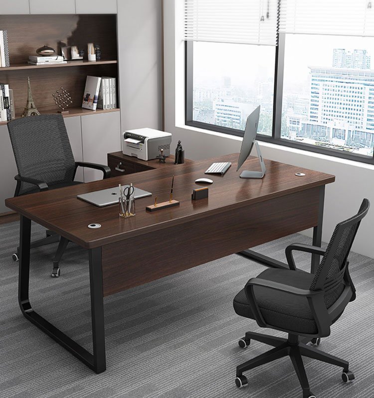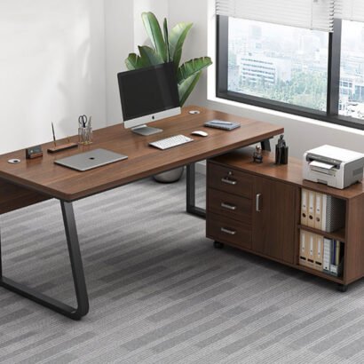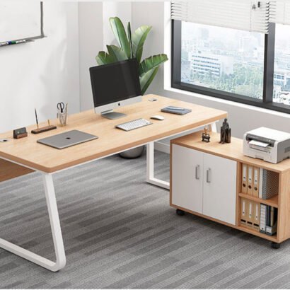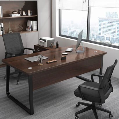 تصميم بسيط ومرتب يعطي شكل احترافي للمكان بدون زحمة تفاصيل. السطح الكبير يوفر مساحة مريحة للكمبيوتر والأوراق والإكسسوارات المكتبية، ومعه قاعدة جانبية تساعد على تثبيت المكتب وإضافة مساحة تخزين أو دعم إضافي حسب الاستخدام. الأرجل المعدنية تعطي ثبات قوي ولمظهر عصري، وبيخلّيه مناسب للاستخدام اليومي في بيئة العمل