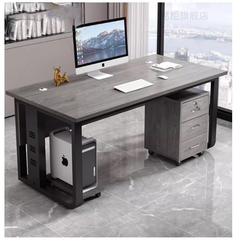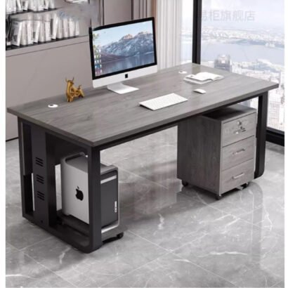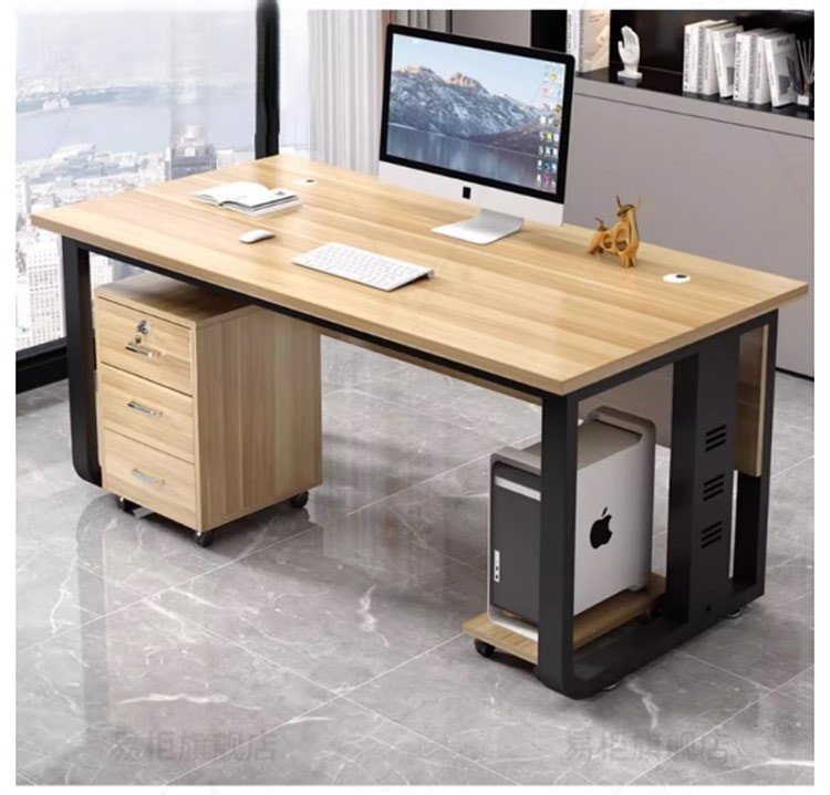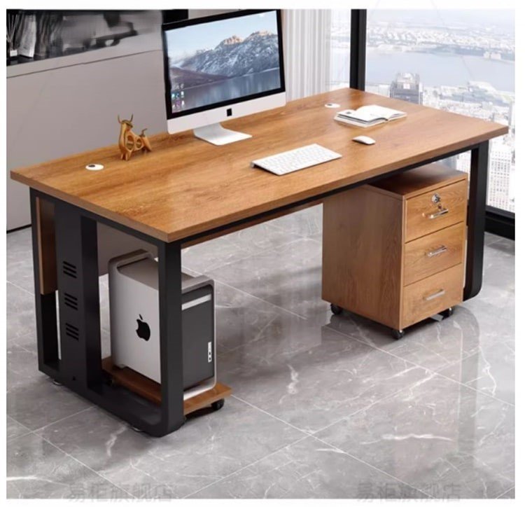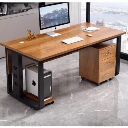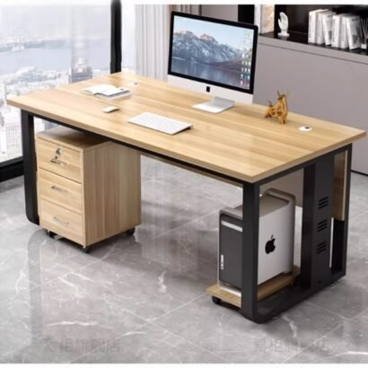 مكتب بتصميم بسيط وشيك يناسب بيئة الشركات والمكاتب الحديثة. سطح العمل الكبير يديك مساحة كفاية للكمبيوتر والكتابة وترتيب الملفات بشكل مريح. في الجانب وحدة أدراج تساعدك تحفظ المستلزمات والأوراق المهمة وتخليها في متناول اليد، وكمان المساحة السفلية مناسبة لوضع جهاز الكمبيوتر أو الأدوات الثقيلة بشكل مرتب. الهيكل المعدني يدي ثبات وتحمل قوي مع شكل عصري يكمّل المظهر الخشبي الدافئ