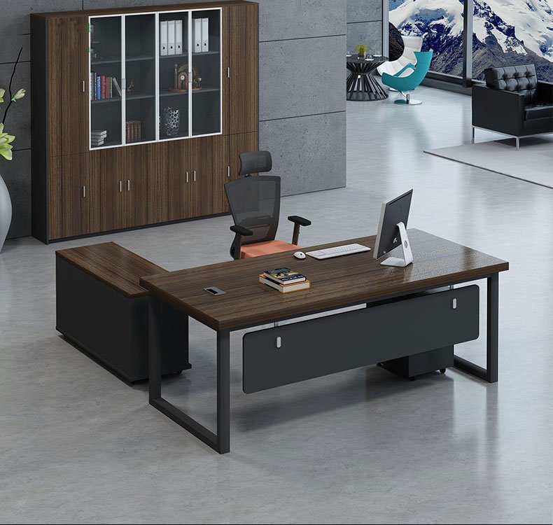 مكتب موظفين مودرن بسطح واسع ووحدة جانبية مدمجة، مناسب لتنظيم الشغل اليومي بشكل أنيق وعملي