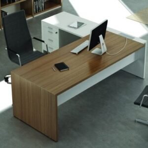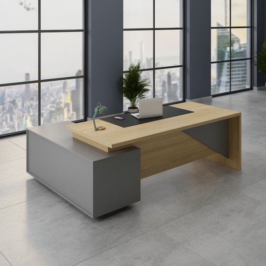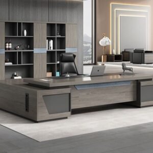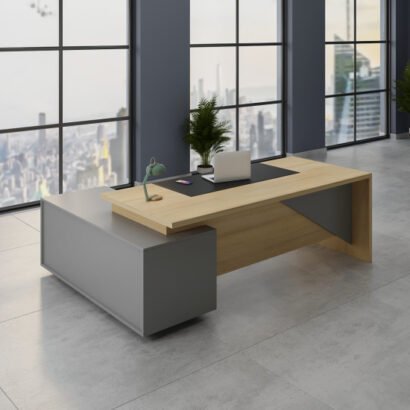 مكتب بتصميم عصري مناسب للمكاتب الإدارية وغرف العمل الحديثة. السطح الخشبي الدافئ بيدي فخامة هادية، ومعاه جزء جانبي باللون الرمادي عامل توازن شيك في الشكل العام. تصميمه على هيئة حرف (L) بيساعدك تنظم شغلك: جزء للكمبيوتر والكتابة وجزء للملفات والأدوات، وده يخلي مساحة المكتب مرتبة وسهلة الاستخدام طول اليوم. شكله بسيط لكنه قوي في الحضور، ويناسب الديكورات المكتبية اللي فيها ألوان حيادية وإضاءة طبيعية