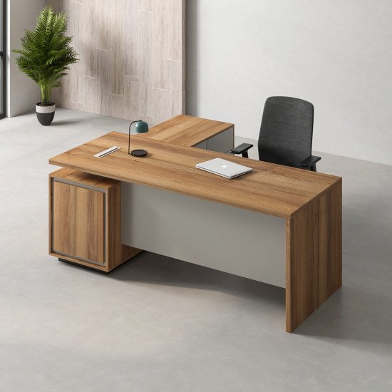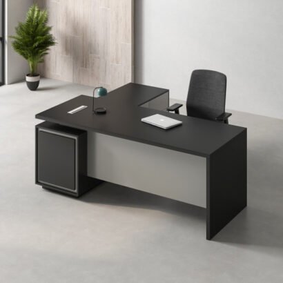مكتب بتصميم إداري أنيق يناسب مكاتب المديرين وغرف الاجتماعات الصغيرة. اللون الأسود يعطي حضور قوي وشكل رسمي، ومع الواجهة الرمادي بيظهر المكتب بشكل مرتب وحديث. سطح المكتب واسع يسمح بوضع اللابتوب والملفات والأدوات اليومية بسهولة، وارتفاعه مريح للشغل لساعات طويلة. التصميم بسيط وعملي ويظهر بشكل ممتاز مع ديكور محايد أو مودرن، وكمان يساعد على الحفاظ على شكل المكتب منظم بدون ما ياخد مساحة كبيرة من الغرفة