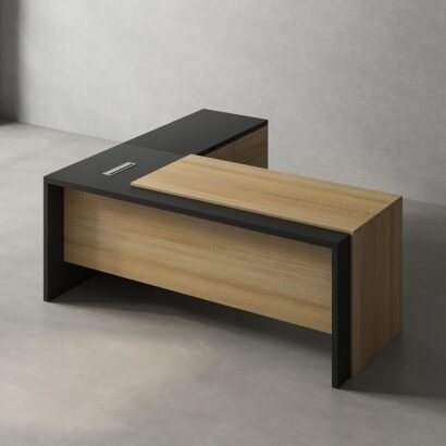 مكتب مدير مودرن بتصميم حرف (L) باللون الخشبي مع إطار أبيض، عملي وشيك للمكاتب التنفيذية