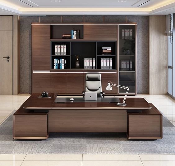 الموديل ده مناسب للي عايز مكتب يدي انطباع ثقة واحتراف من أول نظرة. سطحه الواسع يسمح بتنظيم اللابتوب والملفات والإكسسوارات المكتبية بدون زحمة، ومعه واجهة أمامية أنيقة تخلي شكل المكتب مرتب حتى لو الشغل كتير. التصميم متوازن بين الكتل الجانبية والجزء الأوسط، وده بيدي حضور قوي للمكان وبيخليه مثالي لمكتب مدير أو غرفة اجتماعات صغيرة. الخامة واللون الخشبي الغامق بيظهروا فخامة هادية، وبيتناسق بسهولة مع وحدات التخزين أو المكتبات الخلفية