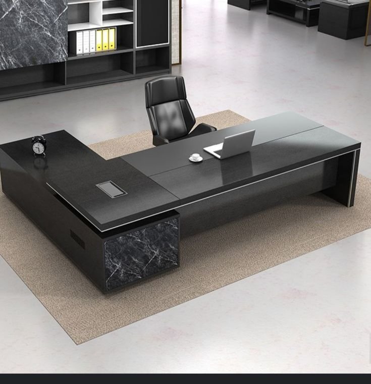 الموديل ده بيجمع بين الفخامة والعملية في نفس الوقت. السطح الكبير مناسب لترتيب اللابتوب والملفات والإكسسوارات المكتبية بشكل منظم، ومع اللمعة الهادية بيبان راقي جدًا تحت الإضاءة. الواجهة الجانبية بتفاصيل تشبه الرخام بتدي طابع “Executive” قوي وبتخلي المكتب قطعة ديكور أساسية مش مجرد مكتب. تصميمه المنخفض والعريض مناسب للاجتماعات السريعة من نفس المكان، وكمان يليق بالمكاتب الحديثة اللي فيها خلفيات تخزين أو مكتبة جانبية زي اللي موجودة بالصورة. اختيار ممتاز لمدير تنفيذي أو مكتب إدارة عليا عايزين شكل فخم بدون مبالغة