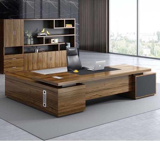 مكتب تنفيذي فاخر بواجهة خشبية دافئة وسطح كبير يعطي حضور قوي، مناسب للمكاتب اللي تركز على الهيبة والعملية معًا