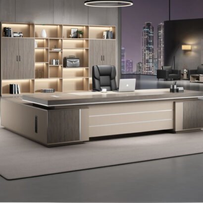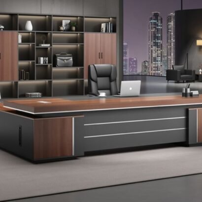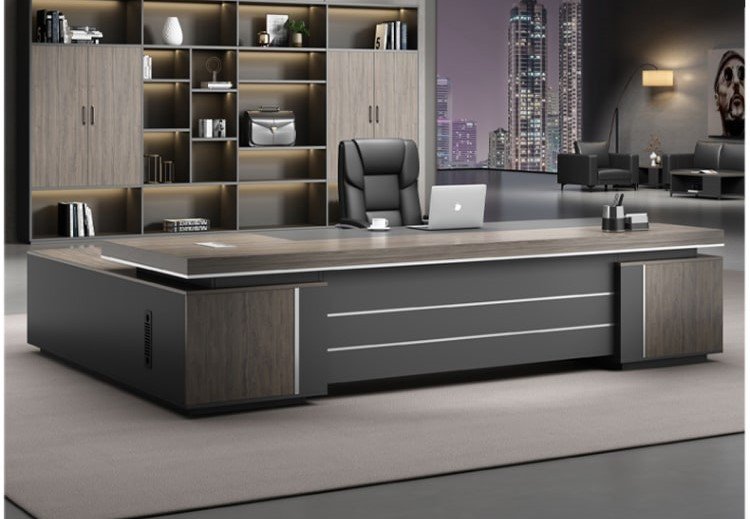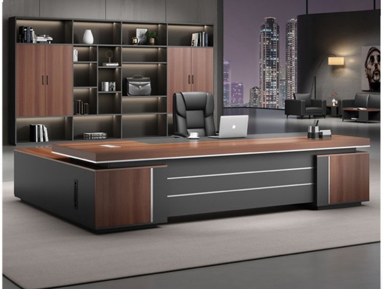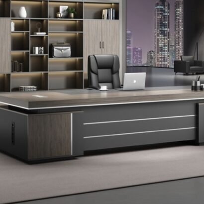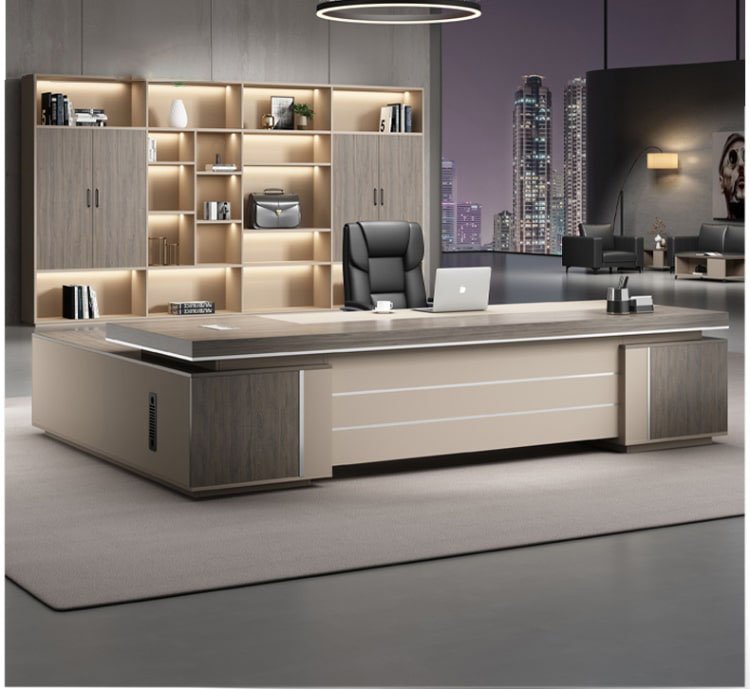 التصميم هنا عملي وشيك في نفس الوقت: سطح واسع يديك حرية كاملة لترتيب اللابتوب والملفات وأدوات المكتب بشكل مريح. الواجهة الداكنة مع الخطوط الطولية بتدي إحساس بالفخامة والهدوء، وده يخلي المكتب مناسب جدًا لغرفة مدير أو مكتب استقبال إداري. كمان التكوين الجانبي يساعد على تنظيم المساحة حوالينك ويخلّي شكل المكتب ثابت ومتماسك بصريًا، خصوصًا مع الإضاءة المكتبية أو خلفية مكتبة/وحدات تخزين زي اللي ظاهرة في الصورة
