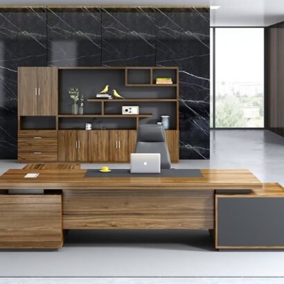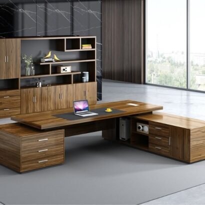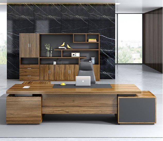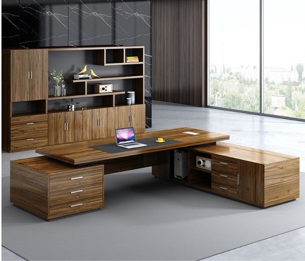 مكتب تنفيذي كبير بسطح واسع يساعدك تشتغل براحة، مع وحدات جانبية عملية للتخزين وترتيب الأدوات بشكل أنيق