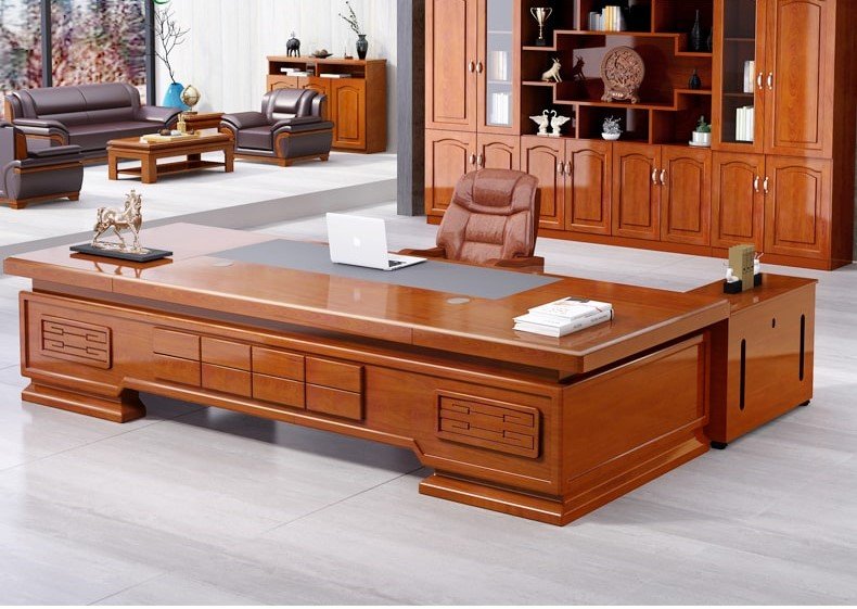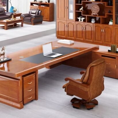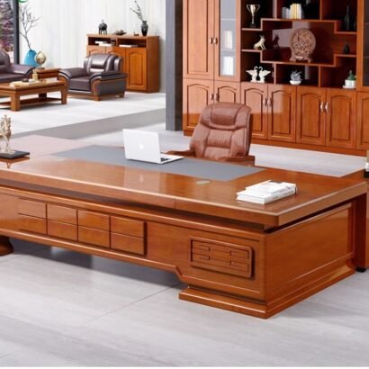 مكتب إداري بتصميم كلاسيكي فاخر يبرز بقوة من أول نظرة بفضل حجمه الكبير وواجهته الأمامية الممتدة. سطح المكتب واسع جدًا ليوفر مساحة مريحة للعمل اليومي ووضع اللابتوب والملفات والإكسسوارات المكتبية بدون تزاحم. الواجهة تحتوي على تقسيمات عملية تساعد في ترتيب الأدوات والمستندات بشكل منظم، مع تفاصيل خشبية تضيف إحساس بالفخامة والثبات. مناسب لغرف المديرين ومكاتب التنفيذيين اللي تحتاج حضور قوي ويظهر قيمة المكان، خصوصًا في المساحات الواسعة مع ديكور خشبي متناسق