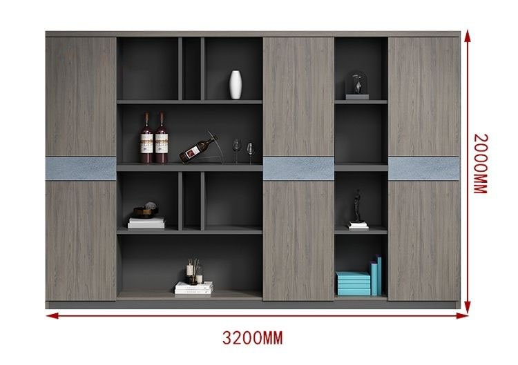 وحدة مكتبية واسعة مناسبة للمكاتب الإدارية وغرف الاجتماعات لأنها توفر تنظيم قوي للمستندات والكتب مع شكل أنيق. المنتصف عبارة عن رفوف مفتوحة متعددة المستويات لعرض الملفات اليومية والكتب وقطع الديكور، بينما الجانبين خزائن طويلة تساعد على تخزين الأشياء اللي تحتاج تكون مخفية للحفاظ على شكل مرتب. وجود شريط ديكور أفقي في المنتصف يدي لمسة عصرية ويكسر شكل الوحدة الكبير. المقاس الكبير يجعلها مثالية للجدران الرئيسية في المكتب، وتقدر تقسّم عليها التخزين حسب الأقسام أو المشاريع لتسهيل الوصول وترتيب العمل