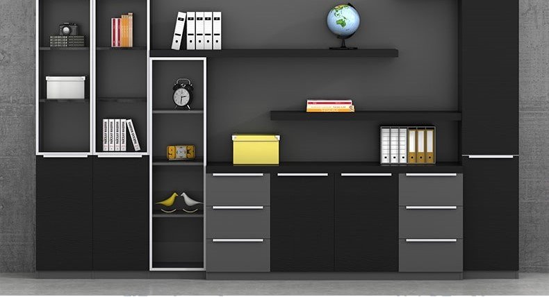 وحدة مكتبية عملية مناسبة للمكاتب الحديثة لأنها بتوفر حل تنظيم متكامل في قطعة واحدة. الرفوف المفتوحة تعطي مساحة لعرض الكتب والملفات اليومية والإكسسوارات، بينما الأدراج السفلية تساعد على حفظ المستندات والأدوات بعيدًا عن الفوضى. اللون الأسود يمنح طابع رسمي وقوي ويظهر بشكل شيك في المساحات الإدارية، خصوصًا مع ديكور فاتح أو إضاءة جيدة. التقسيمات المتعددة تخليك ترتب المحتويات حسب الاستخدام: جزء للملفات، جزء للكتب، وجزء للأغراض الصغيرة، وده يسهل الوصول ويخلّي شكل المكتب دايمًا منظم