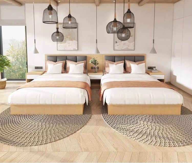 غرفة نوم فندقية مزدوجة بطابع عصري وإضاءة مميزة، تعتمد على سرير كبير مع وحدات جانبية ووحدة تلفزيون/تسريحة أمام السرير. تُنفَّذ بألوان وتشطيبات متعددة حسب الطلب، ويمكن تجهيزها وتسليمها مفروشة بالكامل مع الديكور ووحدات الإضاءة لتجربة إقامة متكاملة