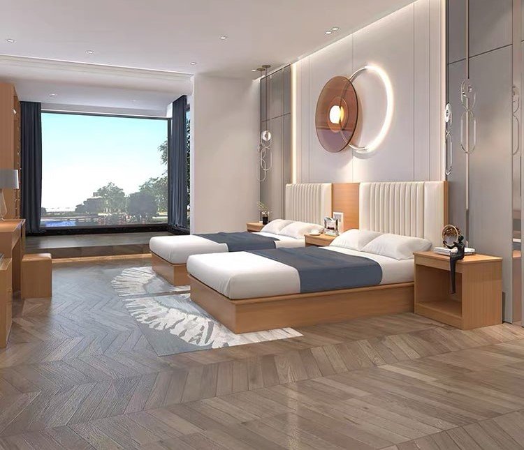 غرفة النوم الفندقية دي آر 204 بتصميم حديث يميل للفخامة، مناسبة للغرف المزدوجة التي تحتاج مساحة مريحة ومظهر راقٍ. يظهر التجهيز بسريرين منفصلين مع ظهر سرير مبطن ووحدات جانبية، إضافة إلى لمسات إضاءة ديكورية على الحائط تعطي الغرفة طابعًا مميزًا. المساحة الواسعة تساعد على حركة الضيوف بسهولة وتُظهر جمال التوزيع داخل الغرفة. تُنفَّذ من ألواح خشبية صناعية عالية الجودة مع تشطيبات وألوان متعددة حسب الطلب، ويمكن تعديل المقاسات والتوزيع وفق مخطط الغرفة المعتمد لتحقيق أفضل استغلال للمساحة.