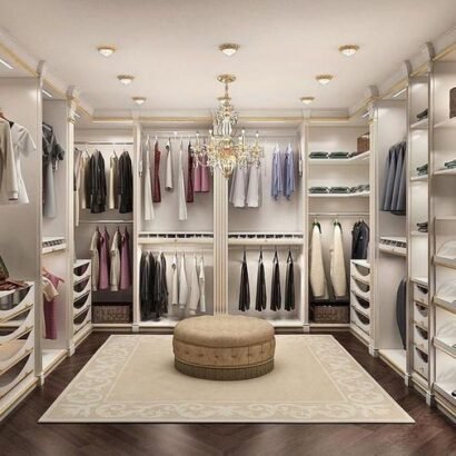 غرفة ملابس فخمة بتقسيمات مضيئة وأدراج كثيرة، مناسبة لتنظيم الملابس والإكسسوارات مع شكل راقي ومريح