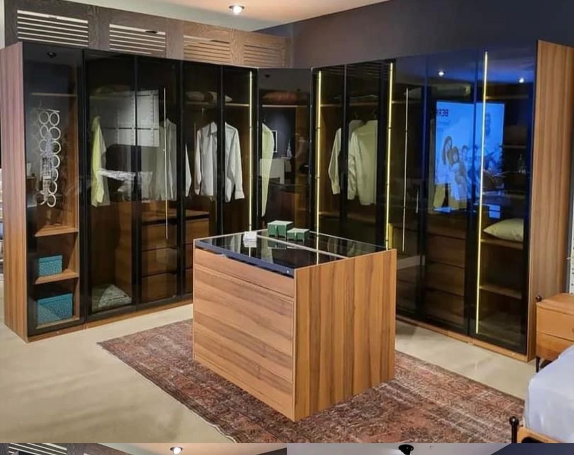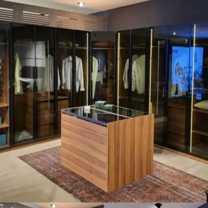 تصميم غرفة ملابس بطابع “VIP” يركز على عرض المحتويات بشكل أنيق من خلال الأبواب الزجاجية اللي تخلي كل شيء ظاهر ومنظم، وفي نفس الوقت تحمي الملابس من الغبار. الإضاءة الداخلية تعطي إحساس فخم وتبرز التفاصيل، خصوصًا في البدلات والقمصان والحقائب. الجزيرة الوسطية تضيف وظيفة مهمة للتخزين والترتيب، وتكون مثالية للإكسسوارات أو تجهيز الملابس قبل الخروج، ومع السطح الزجاجي شكلها يزيد فخامة. توزيع الوحدات على الجوانب يساعد على فصل الملابس حسب النوع أو الموسم، ويخلي الغرفة دايمًا شكلها مرتب ومتكامل. مناسبة لغرف النوم الرئيسية والمساحات الراقية اللي تحب الجمع بين التنظيم والشكل الفخم