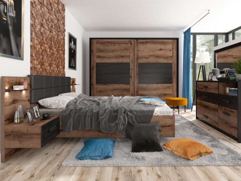 غرفة نوم عصرية بتفاصيل مميزة تجمع بين قوة التصميم وأناقة الخامات، لتمنح المساحة حضورًا لافتًا بطابع راقٍ ومريح في الوقت نفسه. يبرز جمالها من خلال الدمج المتناسق بين درجات الخشب الداكنة واللمسات المنجدة التي تضيف عمقًا بصريًا وإحساسًا بالفخامة. كما أن توزيع القطع بشكل متوازن بين السرير والكومود والدولاب ووحدة الأدراج يجعل الغرفة تبدو أكثر انسجامًا وتنظيمًا، مع أجواء دافئة تناسب محبي الديكورات الحديثة ذات الشخصية الواضحة. وتعد هذه الغرفة اختيارًا مثاليًا لمن يبحث عن الراحة اليومية داخل مساحة أنيقة تعكس الذوق العصري الفاخر