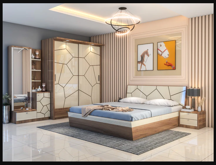 تقدم هذه الغرفة رؤية عصرية أنيقة تجمع بين دفء الخشب ولمسات التصميم الحديث في تكوين متناسق يلفت الانتباه من أول نظرة. يبرز جمالها في التناسق بين السرير والدولاب والكومود مع التفاصيل الزخرفية الهادئة التي تمنح المساحة طابعًا مميزًا بدون ازدحام بصري. كما أن اختيار الألوان الفاتحة مع اللمسات الذهبية والخطوط الهندسية يضيف إحساسًا بالرقي والرحابة، ليظهر المكان بصورة أكثر إشراقًا وأناقة. وتناسب هذه الغرفة من يبحث عن تصميم عملي بمظهر فاخر، يجعل غرفة النوم مساحة مريحة وأنيقة في الوقت نفسه