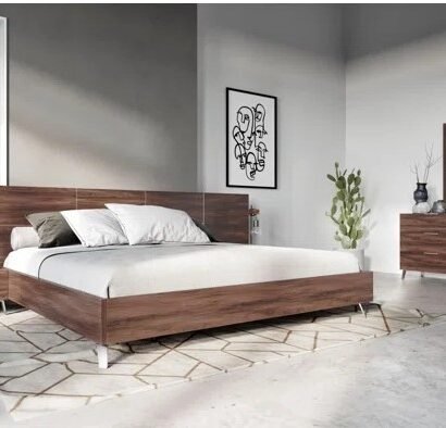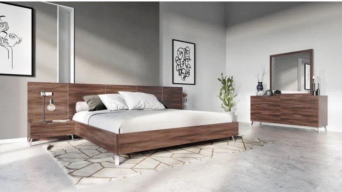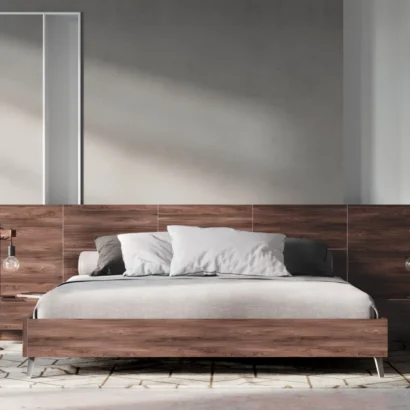 تتميز هذه الغرفة بطابع عصري واضح يعتمد على الخطوط الأفقية الهادئة والتفاصيل الخشبية التي تمنح المساحة دفئًا وأناقة في الوقت نفسه. يظهر السرير بتصميمه المنخفض كعنصر أساسي يبرز رحابة الغرفة ويمنحها إحساسًا بالاتزان والبساطة الراقية، بينما تضيف التسريحة المعلقة والمرآة لمسة حديثة تعزز من خفة التكوين داخل المكان. كما يخلق المزج بين الألوان المحايدة والخشب الطبيعي أجواء مريحة بصريًا، تجعل الغرفة مناسبة لمن يفضل الديكور النظيف والمنظم بدون تفاصيل زائدة. وتعد هذه الغرفة اختيارًا مثاليًا لمحبي التصميمات العصرية التي تجمع بين الراحة اليومية والذوق الأنيق