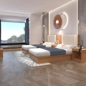 غرفة النوم الفندقية دي إس آر 303 بتجهيز متكامل يناسب الغرف المفردة أو المزدوجة في الفنادق والشقق الفندقية. يأتي التصميم عمليًا ومريحًا مع سرير وتجهيزات جانبية وإضاءة هادئة، بالإضافة إلى وحدة تلفزيون ومكتب/كونسول لتوفير احتياجات الضيف أثناء الإقامة. تُصنّع الغرفة من ألواح خشبية صناعية عالية الجودة مع إمكانية اختيار ألوان وتشطيبات متعددة لتتوافق مع هوية الفندق. كما يمكن تنفيذ المقاسات والتوزيع وفق مخطط الغرفة المعتمد لضمان أفضل استغلال للمساحة وتجربة إقامة مريحة للضيوف.