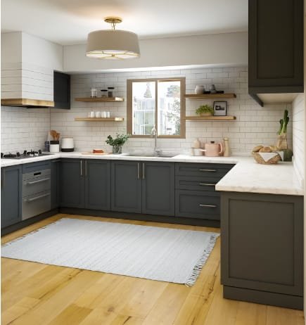 مطبخ حرف U بستايل مودرن ريفي باللون الرمادي الداكن مع سطح رخامي فاتح، مناسب للمساحات العائلية ويعطي دفء وأناقة