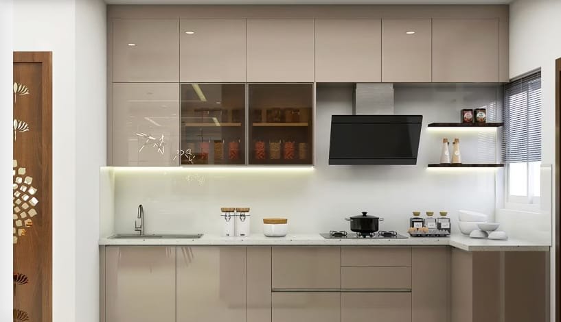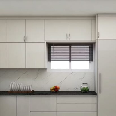 مطبخ بتصميم بسيط يركز على العملية في الاستخدام اليومي، ألوانه الفاتحة تساعد على إضاءة المكان بصريًا وتخليه أوسع وأهدى. التوزيع على شكل حرف L يستغل الزاوية بشكل ممتاز ويخلّي الحركة بين مناطق العمل سهلة، سواء أثناء التحضير أو الغسيل أو الطبخ. الخزائن العلوية والسفلية توفر تخزين جيد للأدوات والمستلزمات، ومع سطح العمل المستقيم تقدر ترتّب الأجهزة الصغيرة وتجهّز الأكل براحة. التصميم مناسب للشقق والمنازل اللي بتحب المطابخ الهادية والمرتبة، ويمشي بسهولة مع أي ديكور لأن لونه محايد وسهل الدمج