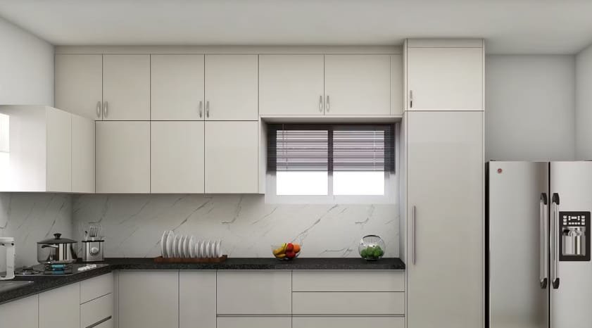 مطبخ عملي بتصميم حرف L باللون الأبيض، مناسب للمساحات المتوسطة ويعطي إحساس بالنظافة والاتساع