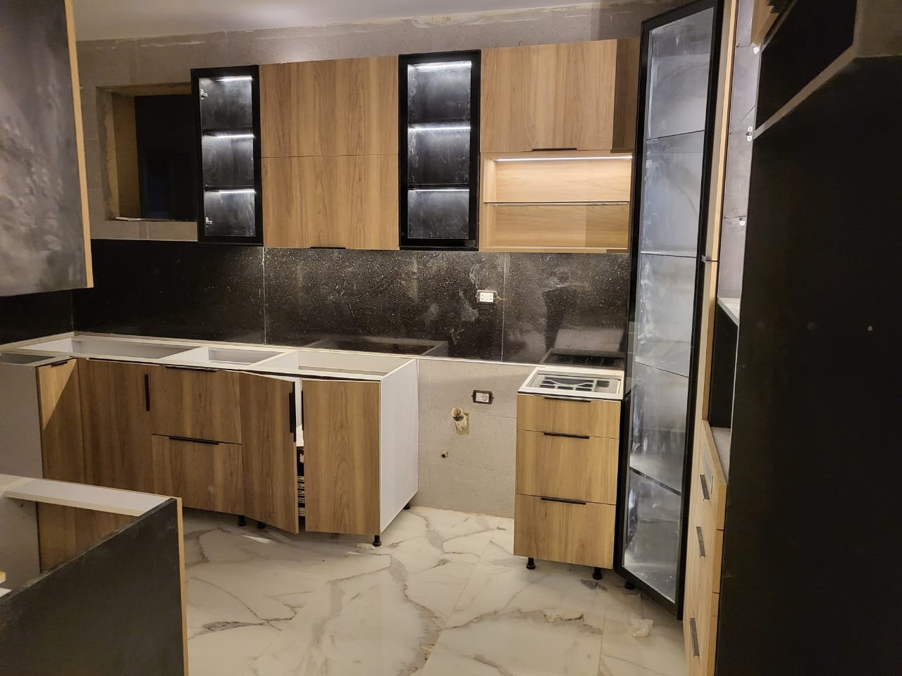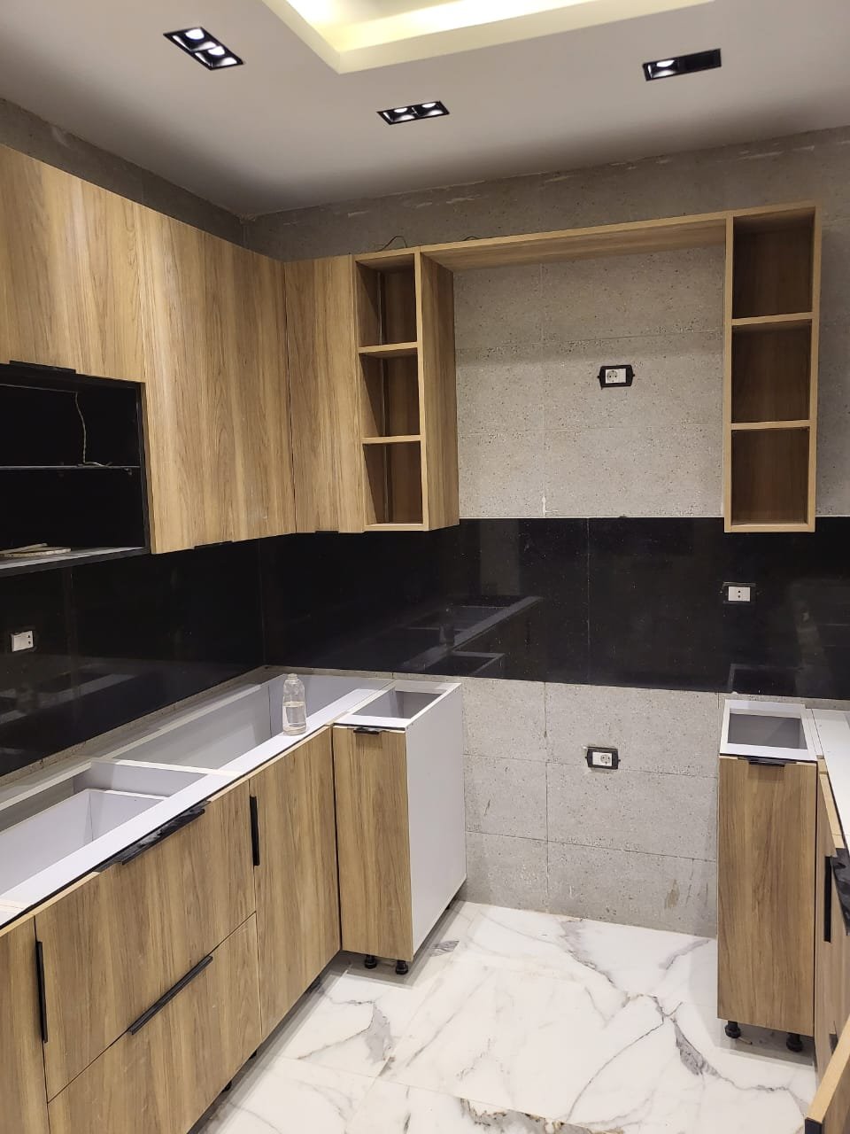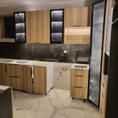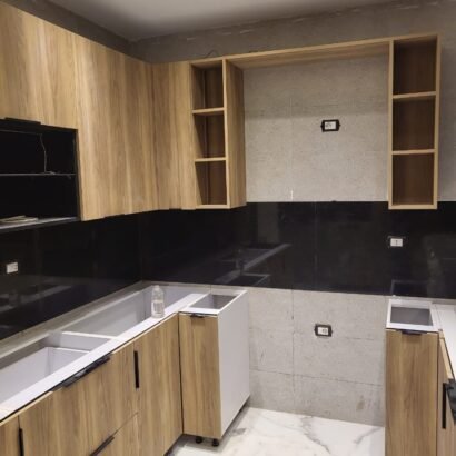 تصميم عملي يستغل ثلاث جهات لتوفير مساحة تحضير كبيرة وحركة مريحة أثناء الطبخ. الخشب الطبيعي يعطي دفء للمكان، بينما السطح والخلفية باللون الأسود يضيفوا طابع مودرن قوي ويخلّوا المطبخ شكله شيك. توزيع الحوض ومنطقة التحضير واضح، ومع الأرفف العلوية المفتوحة تقدر ترتّب أدواتك أو التوابل بشكل عملي وسهل الوصول. التصميم مناسب للمطابخ اللي محتاجة استغلال أقصى مساحة مع تخزين جيد، وبيظهر أنيق خصوصًا مع الإضاءة الجيدة لأن التباين بين الخشب والأسود بيبرز التفاصيل