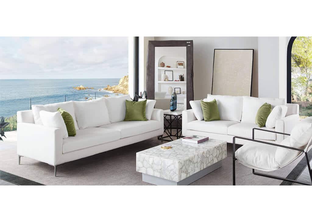 طقم جلسات بإحساس عصري وهادئ، مناسب للأماكن المفتوحة والواسعة ويعطي شكلًا “خفيضًا” مريحًا للنظر. اللون الفاتح يساعد على إبراز الإضاءة الطبيعية ويجعل المكان أنظف بصريًا، ومع وسائد بدرجات خضراء بسيطة يضيف لمسة حيوية بدون زحمة ألوان. الترتيب العام عملي للضيافة اليومية والجلوس الطويل، ويظهر بشكل ممتاز مع طاولة وسط حجرية/رخامية أو سطح فاتح ليكمل الستايل. مناسب للبيوت العصرية أو الاستراحات أو أي مساحة تريدها تبدو خفيفة ومرتبة، ويمكن تغيير طابع المكان بسهولة بإكسسوارات بسيطة مثل وسائد إضافية أو سجادة بنقشة ناعمة.