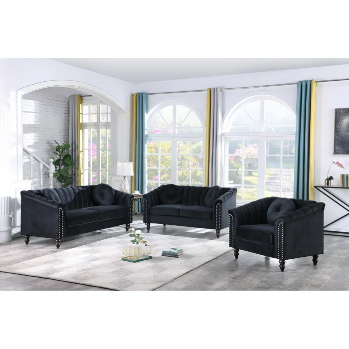 طقم جلوس أنيق باللون الكحلي الداكن بثلاث قطع يمنح المكان فخامة واضحة مع لمسة كلاسيكية، مناسب لغرف المعيشة والاستقبال ويظهر بشكل ممتاز مع الإضاءة الطبيعية والسجاد الفاتح