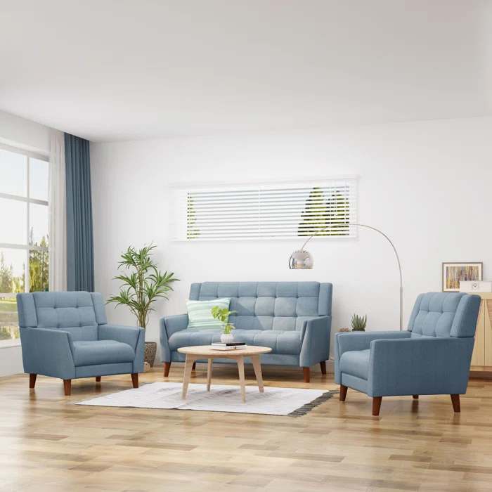طقم جلوس بلون أزرق فاتح يمنح المكان إحساسًا بالهدوء والاتساع، يتكوّن من كنبة وكرسيين بتصميم بسيط وأنيق، مناسب للصالات العائلية والاستقبال اليومي