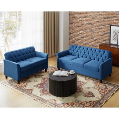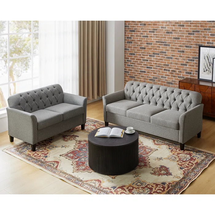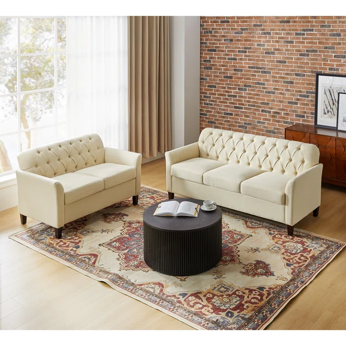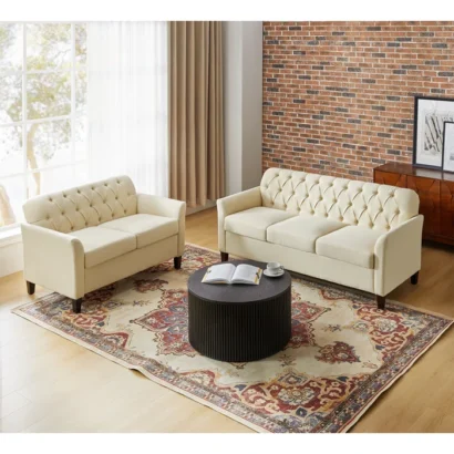 تكوين عملي ومريح بتصميم هادئ يناسب المساحات المتوسطة، ويظهر بشكل راقٍ خصوصًا مع الطوب أو الخلفيات الدافئة. اللون الفاتح يساعد على إنارة المكان ويخلّي الديكور يبان أخف، وكمان يسهل تنسيقه مع سجاد منقوش أو طاولة وسط داكنة. الجلسة مناسبة للضيافة اليومية ولمّات العيلة، وتقدر تزود معاها إكسسوارات بسيطة زي مخدات بألوان مختلفة علشان تغير المظهر بسهولة