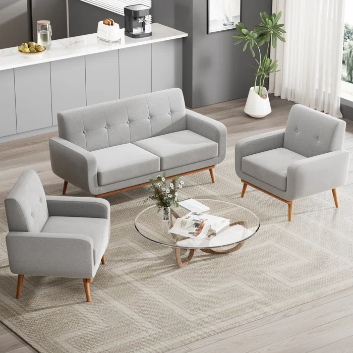 تكوين عملي يتكوّن من كنبة ومعها كراسي مفردة، مناسب للمساحات اللي محتاجة جلسة خفيفة من غير زحمة. اللون الرمادي سهل جدًا في التنسيق مع ألوان كتير، سواء ديكور فاتح أو غامق، ومع السجاد البيج أو الرمادي. الشكل العام يعطي إحساس بالهدوء والنظافة، ويليق مع طاولة وسط زجاج أو خشب حسب ستايل المكان. مناسبة للاستقبال اليومي ولمّات بسيطة، وتقدر تغيّر الإحساس العام بإضافة مخدات أو مفرش بألوان دافئة