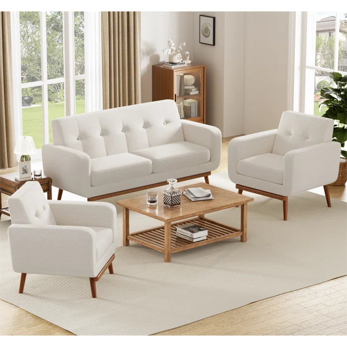 تكوين عملي يتكوّن من كنبة ومعها كراسي مفردة ليكون شكل متناسق داخل الغرفة. اللون الفاتح يفتح المساحة ويظهر الإضاءة بشكل أجمل، خصوصًا في الأماكن اللي فيها شبابيك كبيرة أو إضاءة طبيعية. التصميم بسيط ومرتب ويناسب البيوت العصرية وكذلك الأماكن الرسمية مثل صالات الانتظار. تقدر تكمّل شكل الجلسة بطاولة وسط خشب أو زجاج وإضافة مخدات بألوان قوية عشان تعمل توازن في الديكور. مناسبة للاستخدام اليومي ولمّات الضيوف وتدي شكل راقي من غير مبالغة