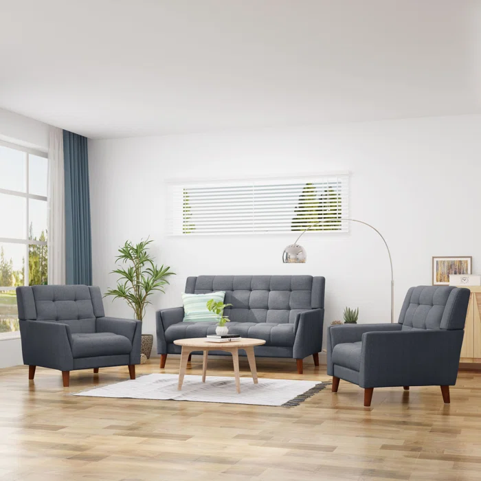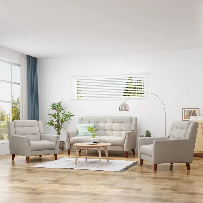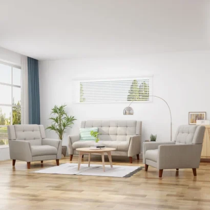 تجميعة أنيقة بألوان فاتحة تساعد على إظهار المساحة أكبر وأكثر إشراقًا، وتناسب البيوت الحديثة والمساحات الهادئة. الكنبة الرئيسية بتصميم مريح وخطوط بسيطة، ومعها كرسيان منفصلان يسهّلوا توزيع الجلسة على حسب شكل الغرفة سواء مفتوحة أو ضيقة. شكل الأرجل الرفيع يعطي خفة في المنظر العام ويخلي الديكور مرتب، ومع اللون الفاتح تقدر تغيّر الطابع بسهولة بإضافة مخدات بألوان مختلفة أو سجاد بنقشة قوية. مناسبة للاستخدام اليومي وللاستقبال، وكمان تنفع للمكاتب أو غرف الانتظار لأنها شيك وبسيطة