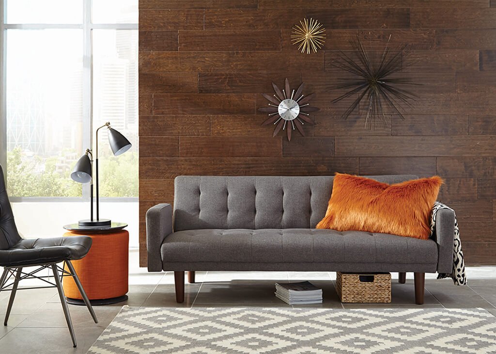 كنبة أنيقة باللون الرمادي بتصميم عصري خفيف، مناسبة للمساحات الصغيرة وتدي شكل مرتب وهادئ مع لمسة دافئة من المخدة البرتقالية