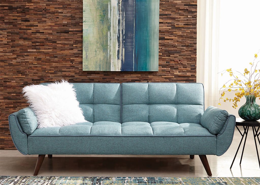 كنبة ثلاثية بلون أزرق سماوي بتصميم مبطّن وخطوط نظيفة مع أرجل خشبية مائلة، مناسبة للصالات العصرية وتدي إحساس هادي ومريح