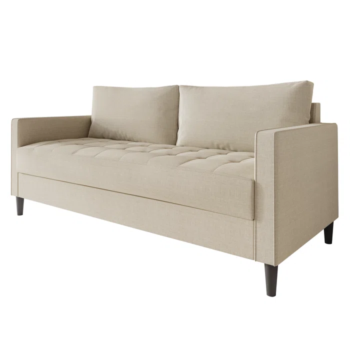 كنبة مودرن بلون بيج هادي بتدي إحساس بالنظافة والاتساع في أي مساحة. تصميمها مستقيم وواضح من غير تفاصيل كتير، وده يخليها اختيار ممتاز للديكورات المينيمال أو العصرية. الوسادتين الخلفيتين الكبار بيوفروا سند مريح للظهر، والمقعد العريض مناسب للجلوس اليومي أو الاسترخاء. المساند الجانبية المستقيمة بتدي شكل مرتب وتساعد في ثبات الجلسة، مع أرجل بسيطة ترفع الكنبة عن الأرض وتخلي شكلها خفيف. تليق جداً مع ألوان خشب فاتح، وسجاد محايد، وكوشنز بألوان زي الزيتوني أو الكحلي أو الطوبي عشان تعمل تباين شيك