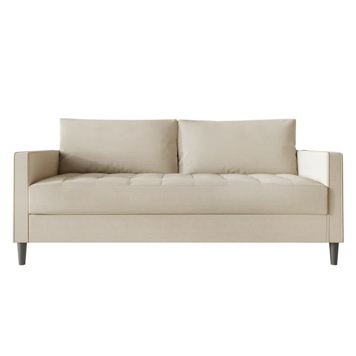 كنبة بلون بيج بتصميم بسيط وراقي مع مساند جانبية مستقيمة وظهر مريح بوسادتين كبار، مناسبة للصالات الهادية والديكور المينيمال