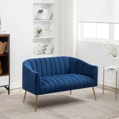 كنبة صغيرة باللون الأزرق بتصميم ناعم ومنحني، مناسبة كقطعة أنيقة للركنة أو غرفة المعيشة وتدي شكل مرتب وحديث للمكان