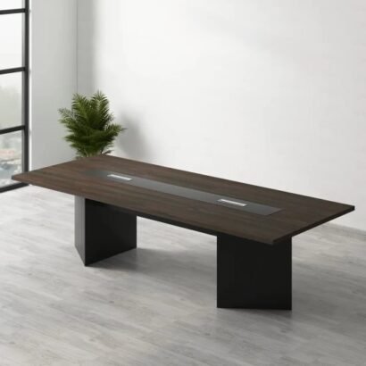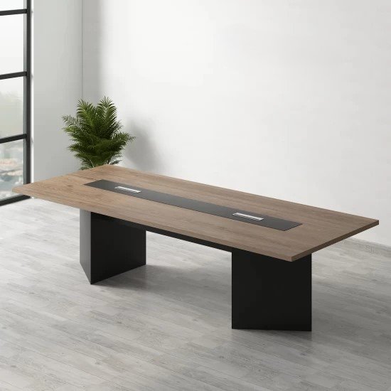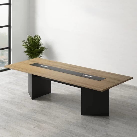 طاولة اجتماعات مودرن بسطح خشبي أنيق وقاعدة سوداء ثابتة، مع مسار مركزي عملي لتنظيم التوصيلات والاكسسوارات