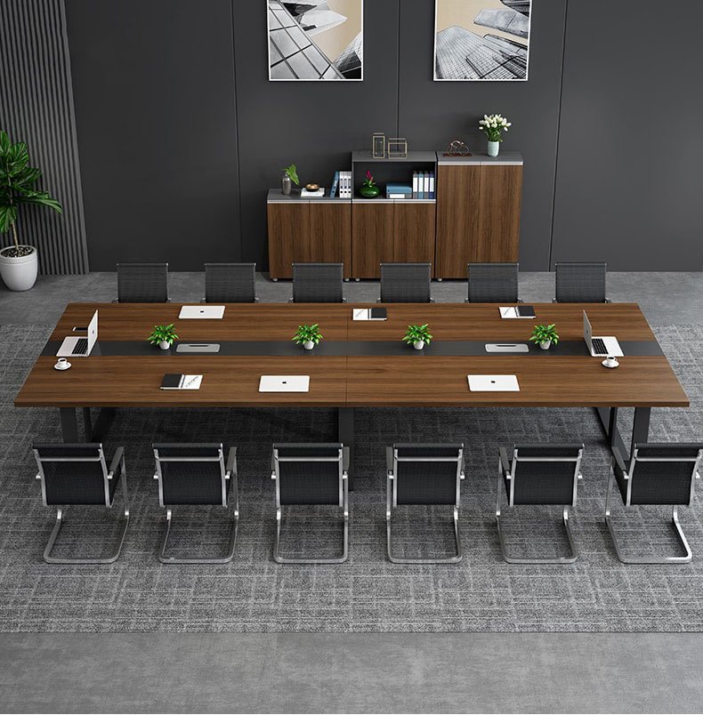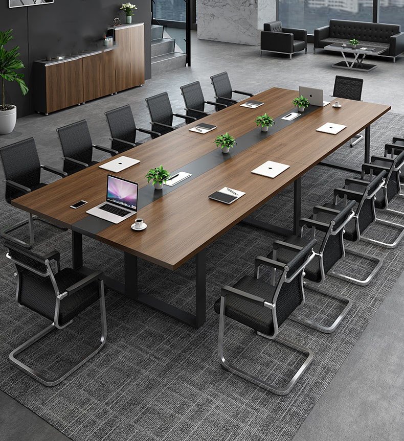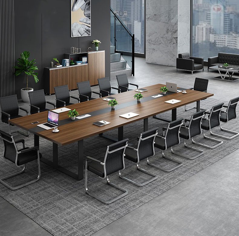 طاولة اجتماعات طويلة بسطح خشبي أنيق وقاعدة قوية، مناسبة لغرف الاجتماعات الرسمية والفرق الكبيرة