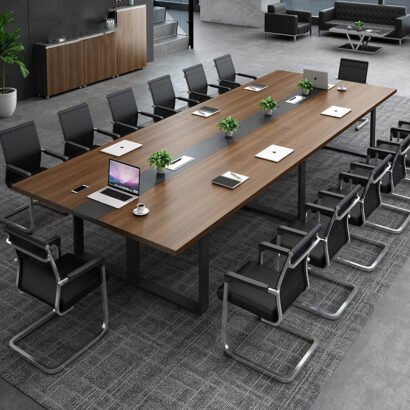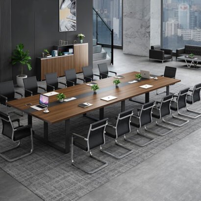 طاولة اجتماعات بتصميم عصري يركز على الاتساع والهيبة داخل قاعة الاجتماع. السطح الخشبي الطويل يمنح مساحة عمل كبيرة تسمح بتوزيع مريح للجلوس ووضع اللابتوبات والملفات لكل الحضور بدون تزاحم. التصميم الطولي يساعد على إدارة الاجتماعات والعروض بشكل منظم، ويعطي حضور بصري قوي يناسب الشركات والمكاتب الإدارية. القاعدة المتينة تمنح ثبات ممتاز مع استخدام يومي مكثف، كما أن خطوط التصميم النظيفة تجعلها سهلة الدمج مع كراسي الاجتماعات المختلفة وديكور المكاتب الحديث. اختيار مناسب للاجتماعات الدورية، جلسات التخطيط، ومناقشات الإدارة العليا داخل بيئة عمل احترافية