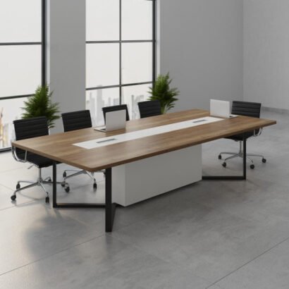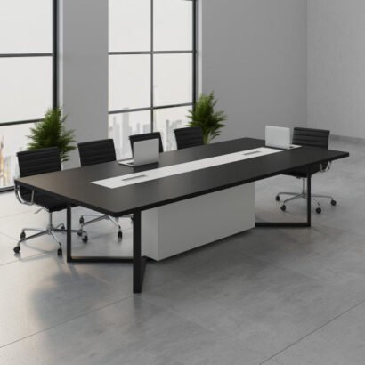 طاولة اجتماعات أنيقة بطابع إداري واضح، تجمع بين سطح أسود يعطي حضور قوي وشكل احترافي، وبين جزء وسطي يساعد على ترتيب مساحة العمل وتوزيع الأجهزة بشكل منظم. طول الطاولة يخليها مناسبة لاجتماعات الفريق أو الاجتماعات الرسمية اللي تحتاج مساحة أكبر للنقاش ووضع اللابتوبات والملفات بدون تكدس. التصميم العام بسيط لكنه فخم، وبيشتغل كويس في المساحات الحديثة اللي فيها زجاج وإضاءة طبيعية، وبيبان مرتب مع كراسي المكتب المتحركة. مناسبة لجلسات التخطيط، مراجعات المشاريع، والاجتماعات اللي فيها عرض سريع أو متابعة مستمرة، مع إحساس عام بالثبات والتنظيم داخل الغرفة