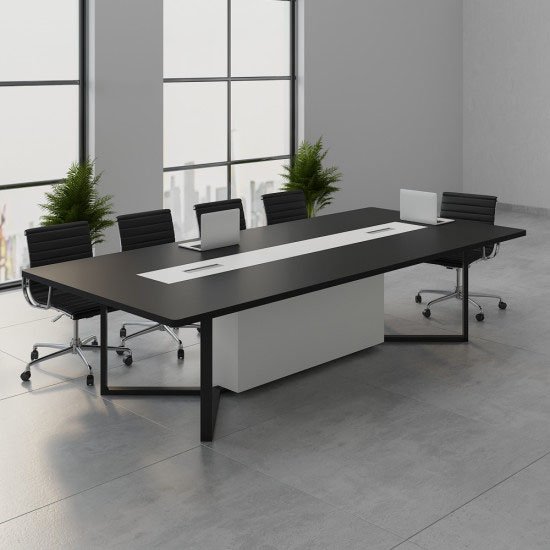 طاولة اجتماعات طويلة بتصميم مودرن باللون الأسود مع جزء وسطي عملي، مناسبة للاجتماعات الرسمية وغرف الإدارة