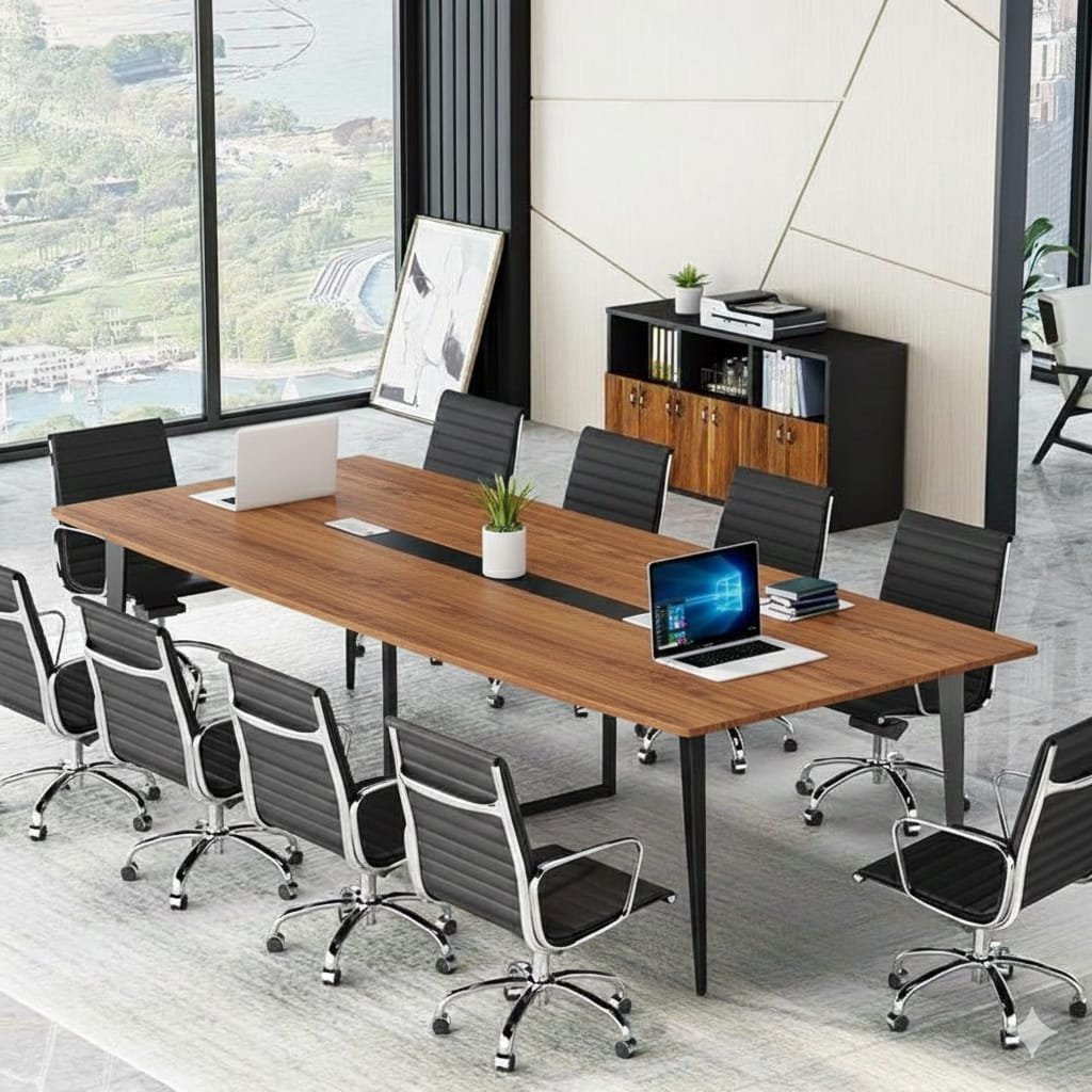 طاولة اجتماعات بتصميم عصري يجمع بين دفء لون الخشب وشكل القاعدة المعدنية البسيطة اللي بتدي ثبات وأناقة في نفس الوقت. سطح الطاولة واسع ومريح للاستخدام اليومي، وبيستحمل توزيع اللابتوبات والدفاتر والملفات من غير ما تحس بضيق، وده يخليها اختيار ممتاز لاجتماعات الفريق ومناقشات المشاريع. شكلها عملي جدًا في المكاتب الحديثة، خصوصًا مع الكراسي المتحركة، وبتدي انطباع مرتب ومنظم داخل غرفة الاجتماعات. مناسبة للاستخدام في جلسات التخطيط، متابعة الأداء، الاجتماعات الدورية، أو حتى استقبال العملاء في بيئة رسمية لكن بروح مودرن