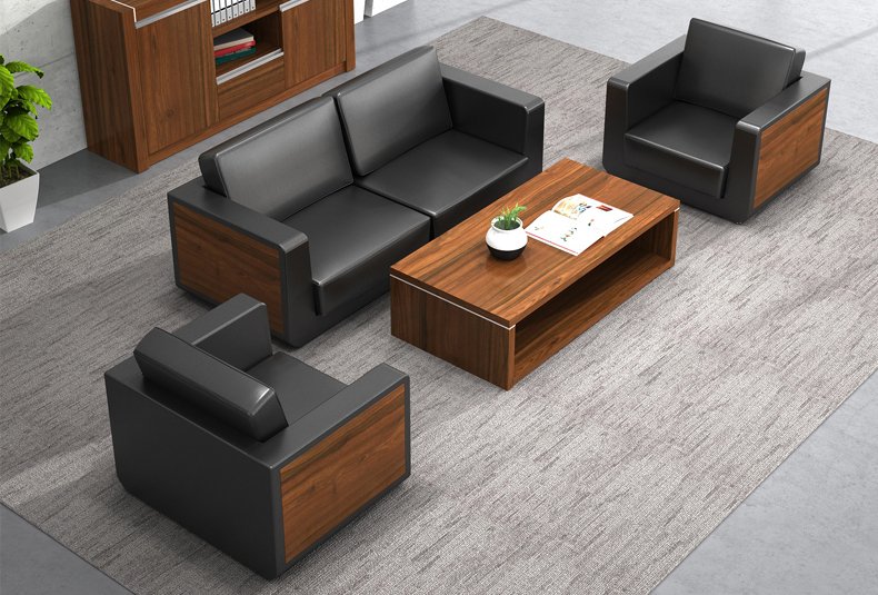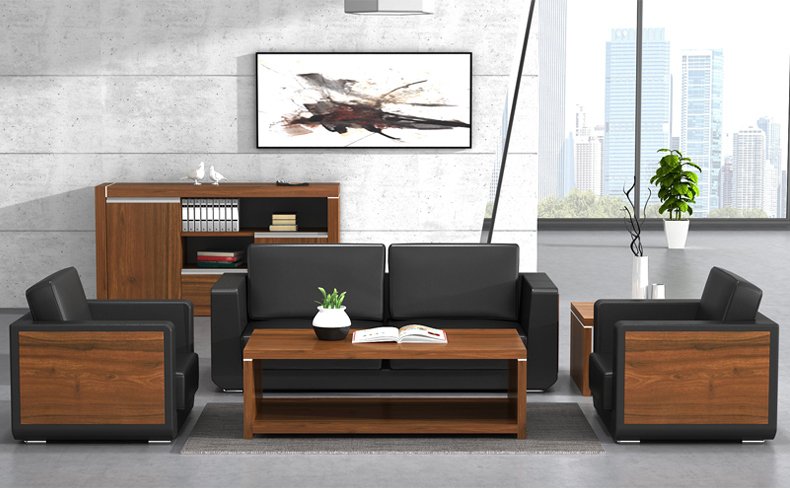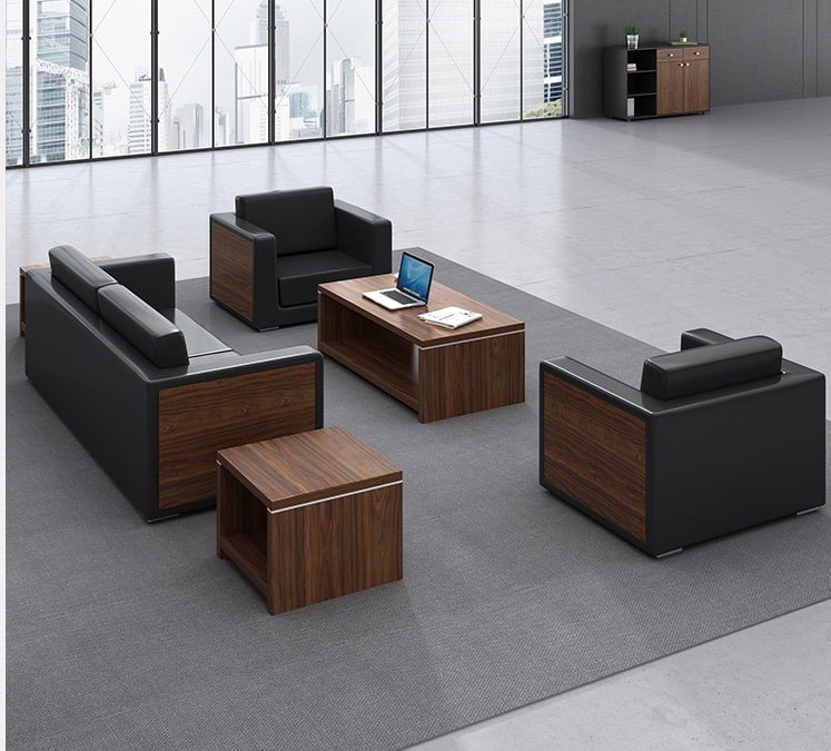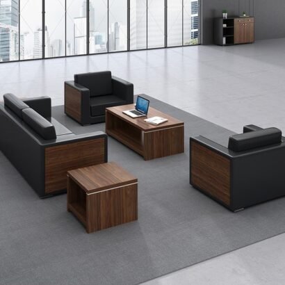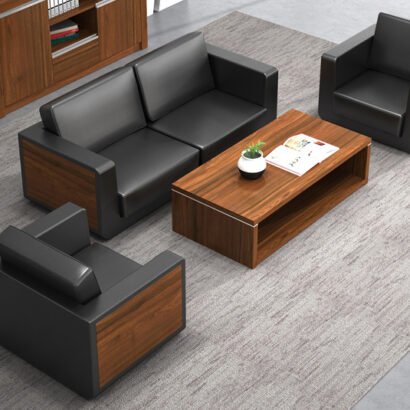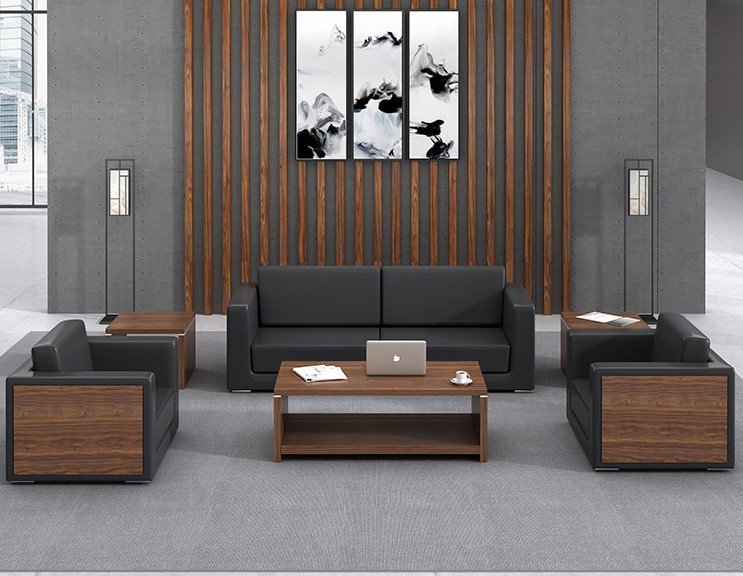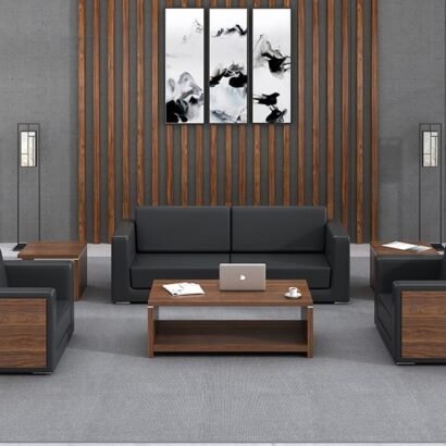 يقدم هذا الطقم المكتبي مزيجًا متوازنًا بين الفخامة العملية والطابع الإداري الحديث، ليكون مناسبًا لمساحات الاستقبال والمكاتب التنفيذية الراقية. يبرز جماله من خلال تناغم الكنبة الرئيسية مع المقاعد الجانبية والطاولة الوسطية، إلى جانب اللمسات الخشبية التي تضيف دفئًا وأناقة واضحة للمشهد العام. كما تمنح الخلفية المصممة بخطوط رأسية وديكور الحائط إحساسًا بالقوة والتنظيم، مما يعزز من حضور المكان ويجعله أكثر تميزًا وهيبة. ويعد هذا الطقم اختيارًا مثاليًا لمن يبحث عن أثاث مكتبي يجمع بين الراحة، والرقي، والانطباع المهني القوي
