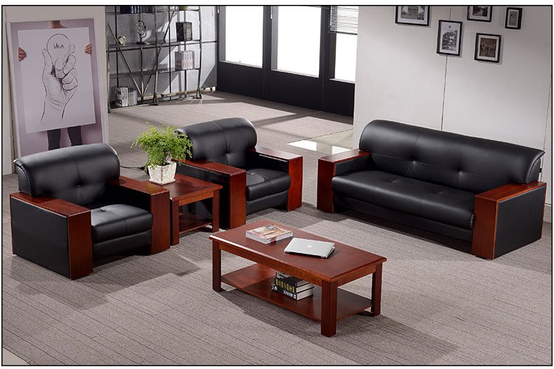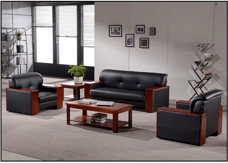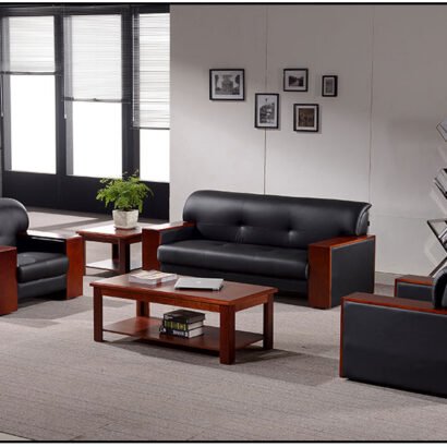 يتميز هذا الطقم المكتبي بتكوين متوازن يجمع بين البساطة والأناقة في شكل يناسب مساحات الاستقبال والمكاتب الإدارية. يتكون من كنبتين ومقعد منفصل مع طاولة وسطية وطاولة جانبية، ما يوفر جلسة منظمة ومريحة تساعد على استقبال الضيوف والعملاء بصورة احترافية. كما تضيف الجوانب الخشبية الواضحة لمسة دافئة تكسر حدة اللون الداكن وتمنح الأثاث حضورًا أنيقًا ومتناسقًا داخل المكان. ويعد هذا الطقم اختيارًا مناسبًا لمن يبحث عن أثاث مكتبي عملي بمظهر راقٍ يحقق الراحة ويعزز من شكل المكتب العام