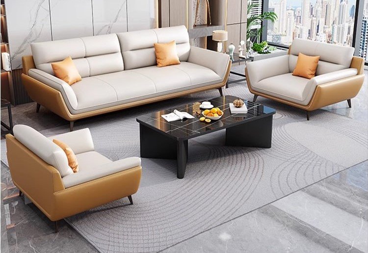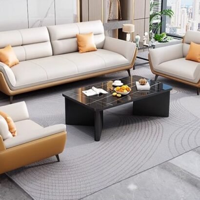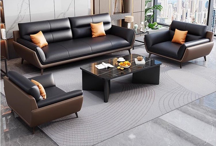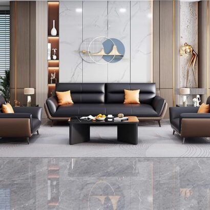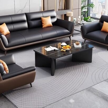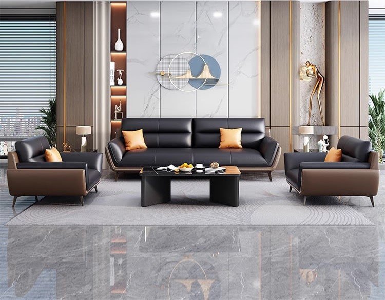 يعكس هذا الطقم المكتبي أسلوبًا راقيًا يجمع بين الفخامة الحديثة والراحة العملية، ليكون مناسبًا للمكاتب التنفيذية ومساحات الاستقبال التي تهتم بالتفاصيل المميزة. تتوزع الكنبة الرئيسية مع المقاعد الجانبية بشكل متناسق يمنح المكان توازنًا بصريًا واضحًا وجلسة مريحة للضيوف والعملاء. كما تضيف الألوان الداكنة مع الوسائد الهادئة والخلفية الرخامية لمسة فاخرة تعزز من أناقة المساحة وتمنحها طابعًا أكثر تميزًا. وتزيد الطاولة الوسطية والتفاصيل الديكورية المحيطة من اكتمال المشهد، ليظهر المكتب بصورة منظمة وراقية تعكس الذوق المهني العصري