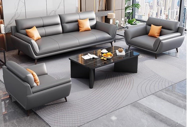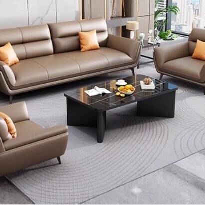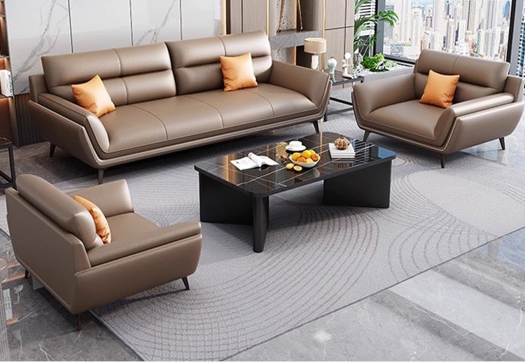 يتميز هذا الطقم المكتبي بأسلوب عصري يجمع بين الأناقة والراحة في تكوين متناسق يناسب مساحات الاستقبال والمكاتب الإدارية الراقية. تتوزع الكنبة الرئيسية مع المقعدين الجانبيين بشكل يمنح المكان إحساسًا بالاتزان والانفتاح، بينما تضيف الألوان الهادئة مع الوسائد الدافئة لمسة ترحيبية أنيقة تكسر الطابع الرسمي التقليدي. كما تعزز الطاولة الوسطية بتصميمها البسيط من جمال التكوين العام، وتمنح المساحة مظهرًا منظمًا يساعد على استقبال العملاء والزوار بصورة مريحة وراقية. ويعد هذا الطقم اختيارًا مناسبًا لمن يبحث عن أثاث مكتبي يجمع بين الراحة اليومية والطابع المهني الأنيق